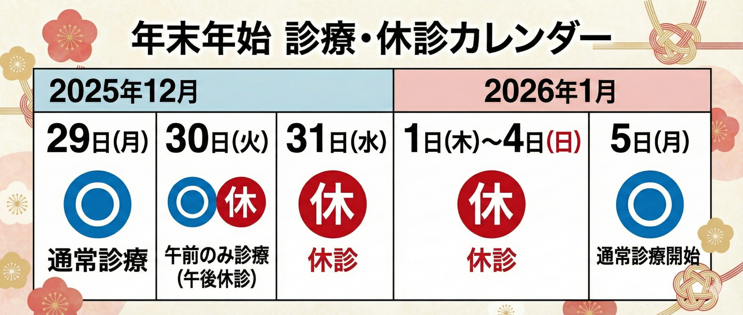 【休診期間】 2025年12月30日(火)午後 ~ 2026年1月4日(日)